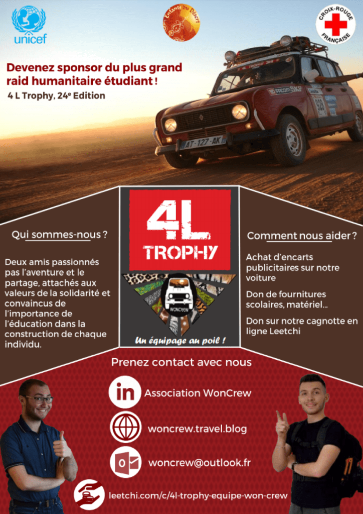 En février 2021, à bord de notre 4L, nous allons parcourir plus de 6 000 km à travers la France, l’Espagne et le Maroc en 10 jours. En partenariat avec des organismes humanitaires tels que l’UNICEF, la Croix-Rouge et l’association “Enfant du Désert”, nous acheminerons du matériel dont les enfants les plus démunies ont besoin.